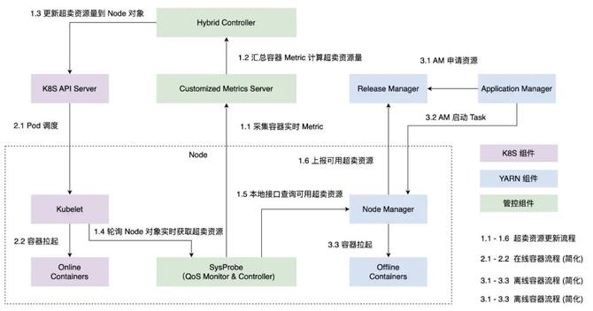 该方案在链路上基于 Kubernetes 和 Yarn 两套体系实现联合管控,在单机上同时运行 Kubernetes 和 Yarn 的管控组件,配合中心协调组件对两套系统可见的资源量进行分配。在联合管控系统之上,团队基于服务资源画像实现实时的资源预估,在保证各类服务 SLA 要求的前提下,实现更加灵活和动态的资源分配。