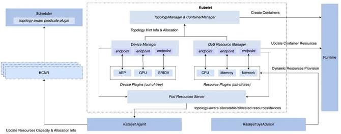 在单机调度侧:Katalyst 搭载 Enhanced Kubernetes 里的扩展模块 QoS Resource Manager (QRM) 能够实现可插件化的微拓扑亲和性分配,并通过自定 CRD 将微拓扑上报到中心打通调度流程;在服务运行过程中,Katalyst 会持续观察 Pod 运行时系统指标,集合业务 QoS 要求和业务指标反馈进行预估,决策出 Pod 在各个资源维度上的分配量,通过 QRM reconcile 机制实时下发到 CRI。上述过程中的资源预估模型和 QRM 实现,都可以通过插件化的方式定制,使得资源调控的策略更加匹配不同业务场景的诉求。