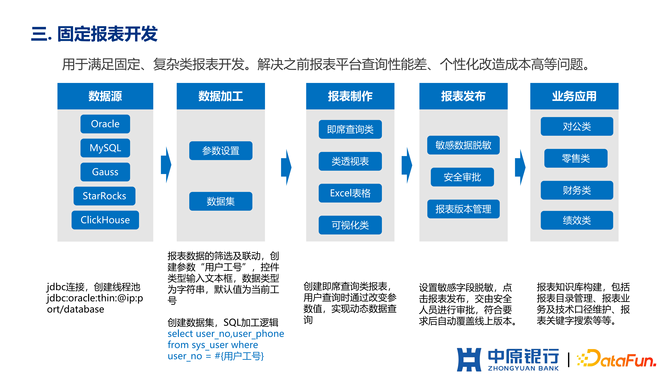 (4)报表发布。第一,由于行内对数据安全的严格管控,需要进行数据脱敏,否则是不能进行正常的报表发布的;第二,安全审批,需要走一个报表发布的流程;第三,报表版本管理,报表有两个版本,一个是制作的版本,一个是线上的版本,制作的版本只有通过发布审批之后才会把线上的版本覆盖掉。