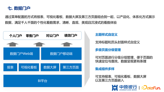 (7)个性化门户。是为了统一数据出口,把报表可视化看板以及大屏统一输出在一个门户中,供业务人员日常查询使用。