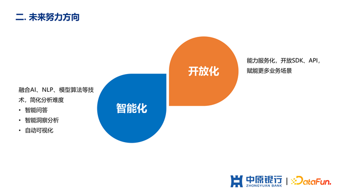 (1)第一个是平台的智能化建设。通过融合 AI、NLP、模型算法等技术去简化用户的分析的难度。比如我们智能问答的尝试;后续会做一些智能洞察分析,是通过平台去自动发现问题,定位问题;另外是自动可视化,比如发现问题之后,怎么通过可视化展示这些问题,让用户可以看到这些问题,这是我们未来在智能化方面要探索的内容。