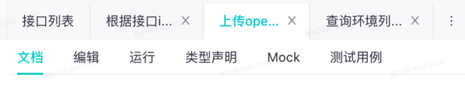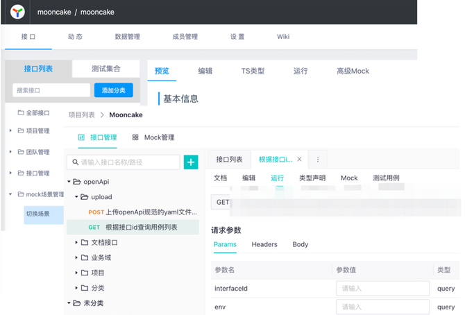 Mooncake这次升级,融合了Yapi和Mock,除了技术底层在数据上的融合,交互上,也尽可能的保留了原有的交互习惯,比如通过idea上传文档的习惯,比如按照文档、编辑、运行、类型声明去组织页面tab: