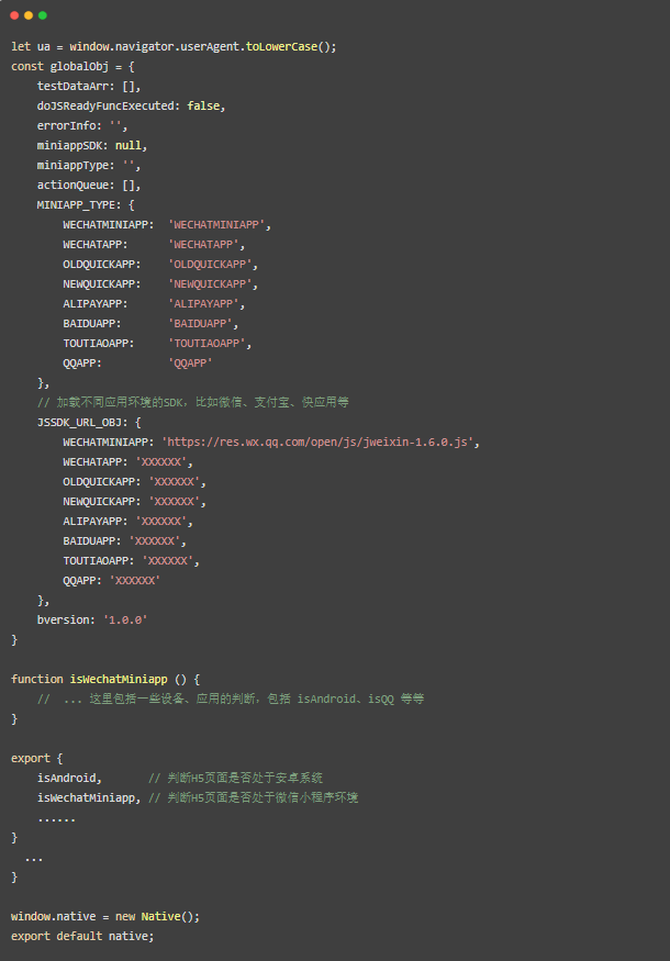 H5页面投放在小程序WebView,在配置完合法域名后,即可在小程序应用中展示。那么,针对不同厂商小程序,可能法务、厂商合规有所差异,需要H5判断所在的环境,去调用不同 api 方法,展示不同的业务页面。