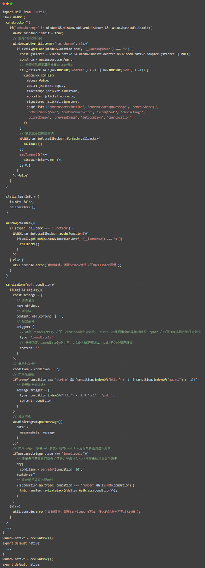 在处理小程序webview的业务方面,可以通过封装一个包含各端环境的SDK,在H5初始化时加载,打通H5和小程序webview之间的通道,实现H5控制分享、登录态同步、支付信息同步等功能。