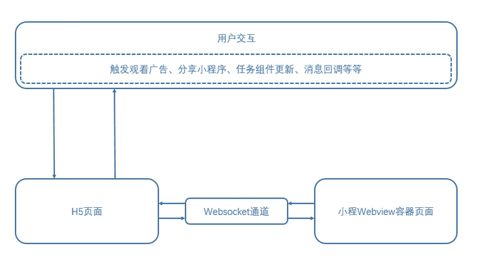 H5页面就可以通过 socket 通信更改并调用小程序的胶囊栏分享、通知webview容器页面调用小程序广告、也可以调用唤起小程序页面中的分享组件面板、触发左上角物理返回时及时通知H5页面触发回调等诸多业务;同时小程序容器页面原生事件完成后(比如广告、分享)再次通过socket返回给H5页面的回调,实现小程序webview跨页面的实时通信。