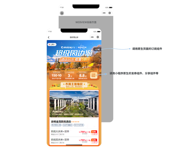 webview容器中绑定了 小程序分享miniShare 、小程序订阅openScribe、 健康检查health等常用业务API,用于处理广告、订阅、任务更新等业务实时回调;H5业务可通过此接口设置触发小程序原生页面的一些原生功能,为上层业务提供服务。