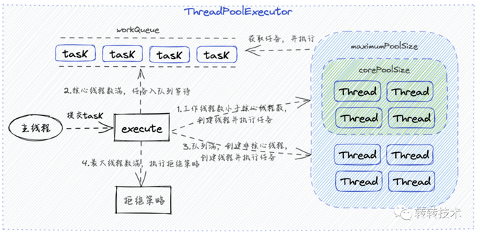 线程池是一种常见的多线程并发编程技术,它将多个线程组织在一起,以便能够更有效地管理和控制它们的执行。线程池中的每个线程都可以被重复利用,避免了频繁地创建和销毁线程所带来的开销,同时还可以限制系统中的线程数量,从而避免了资源的浪费和竞争。2019年刚参加工作时,我第一次使用线程池是在处理用户请求,该请求需要聚合多个服务的数据,然后返回给用户。调用的服务均比较耗时,如果串行的去调用那么系统的响应时间就会非常长。所以,我决定使用多线程来并行执行这个聚合操作,因此也引入了线程池。在Java中线程池是通过java.util.concurrent包提供的ThreadPoolExecutor类来实现的。通过创建ThreadPoolExecutor对象并设置其参数,线程池运行大致分为4个阶段大致如下图: