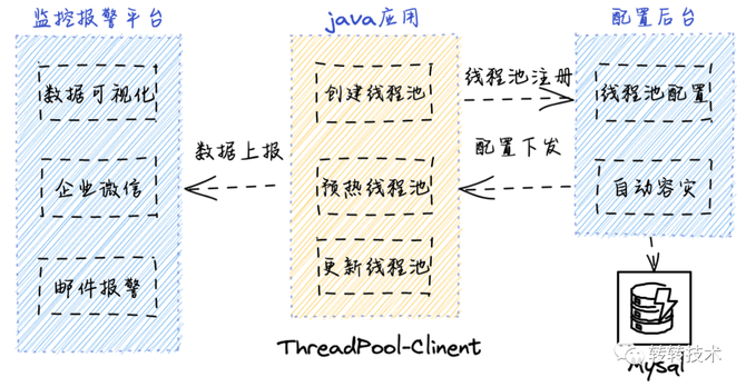 动态线程池主要包含客户端、监控平台、配置后台三部分: