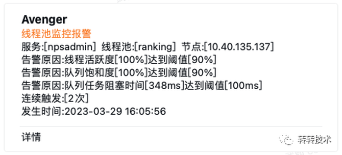 监控报警平台主要负责线程池运行状态的监控,可对线程池的线程池活跃度,队列饱和度,队列阻塞耗时进行监控和报警。使得程序员能够对线程池的运行情况进行直观的观察。