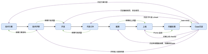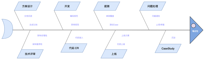 从开发到上线,如何保证稳定性?以多利熊业务稳定性建设落地实践介绍,主要从以下几个阶段:方案设计、技术评审、开发、CR、提测、上线、问题处理、Case沉淀 实施落地,具体内容如下图: