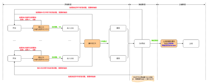集中式CR,涉及到多个模块联动的,以需求为单位,在上线前发起,此环节是上线前质量把控很重要的一个环节,可以发现模块间由于理解偏差导致的依赖使用问题或逻辑问题。