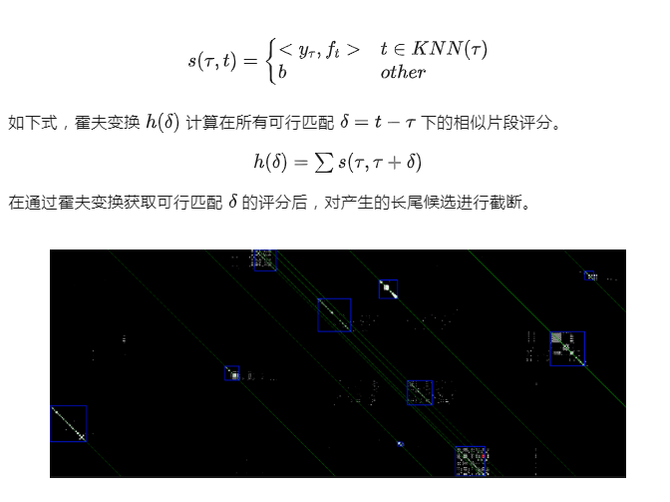 如上图所示,在获取候选的基础上,通过寻找最长的匹配序列,可以得到初步的匹配关系,即图中矩形框所代表的查询视频与注册视频匹配关系,并以此为基础进行过滤。考虑到损失矩阵中,匹配序列可能存在噪声的问题,可通过开闭操作、近邻序列合并等策略进行优化。另外视频序列匹配存在一对多匹配的现象,采用非极大值抑制可以较好的缓解这一问题。由于外部蓝色框的抑制,上图中红色框所代表的匹配关系将不会出现在最终的匹配结果中。