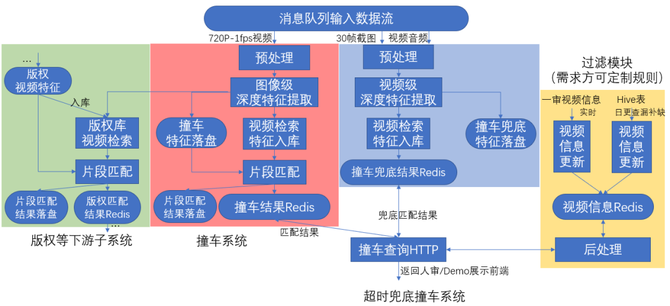 我们将撞车系统设计为4个子系统:版权等下游子系统、撞车系统、超时兜底撞车系统、过滤模块。