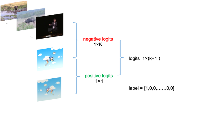 具体训练方法如上图所示,首先准备一系列图片作为负样本集,如第一行所示。这个负样本集保持足够大,并且随着训练的过程动态更新。然后输入一张训练图像和它的随机数据增强,如二、三行所示。值得强调的是这个数据增强是模拟图片常见的编辑方式,例如裁剪、翻转、改变颜色、模糊等等,这两张图像可以认为是正样本对,也可以理解为两张图像相似。训练的过程中将上述提到的图像通过卷积神经网络提取特征向量,两张正样本的特征需要接近,计算两张图像的余弦相似度得到 positive logits。同样的,计算第二行图像和第一行的负样本特征的余弦相似度得到负样本的 negative logits。将positive logits 和 negative logits拼接起来可以得到一个形状为 1 × (1+k) 的logits向量。而这个向量的含义我们是知道的:其中1是正样本的相似度,k 为负样本的相似度。只需要用长度(1+k)的label [1,0,0 ……,0,0]就可以约束,以交叉熵为loss就可以训练模型了。