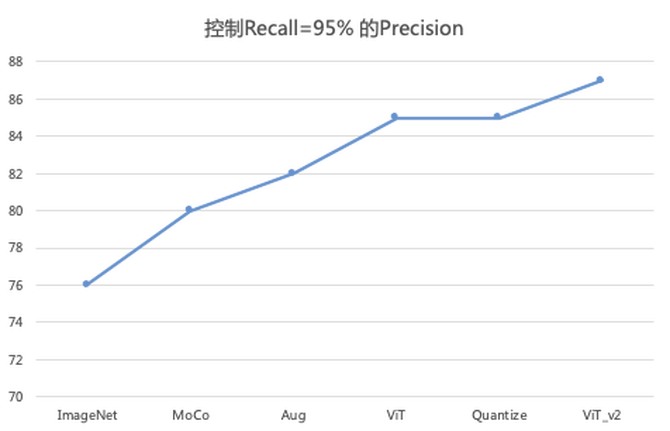 为评估模型的特征提取效果,我们准备了一批图片对作为测试集,包含3万组正负图片对。测试方法是评估模型能不能将相似的图片匹配上,将不相似的图片区分出来。在模型迭代过程中,我们首先使用了开源的ImageNet作为baseline,后续做了MoCo、数据增强 (Aug)、轻量ViT蒸馏ResNet50(ViT)、对ViT进行8bit量化加速(Quantize)、大ViT蒸馏ResNet50(ViT_v2)等优化,迭代效果逐步提升。