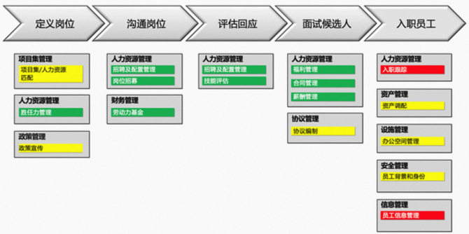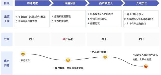 有了全局的人&责概览后,通过分析特定场景工作模式可以发现需求,问题或解决机会。这里的转变是:不只关注当前单个需求,而是从全局视角看业务诉求,从而对需求的合理性,重要性有更合理的判断;为设计方案提供业务视角考虑。例如下图例子描述员工招聘的工作模式。(从中可以看出入职阶段有提升较大空间)