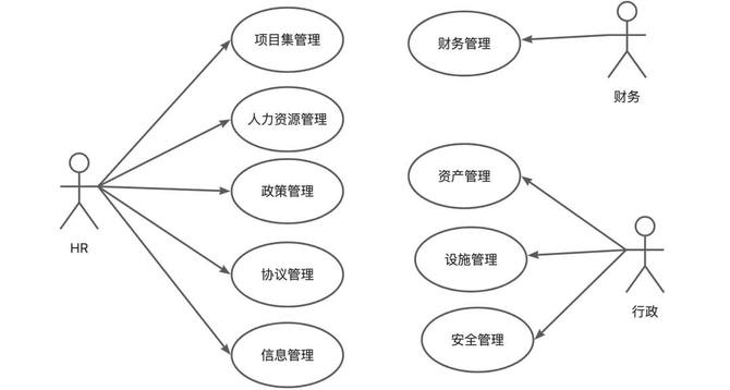 使用UML用例图描述业务中的"人"和责。营商业务里有3种角色,各角色责任如下图展示