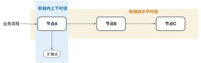 在生活中同层级机构对话、机构内上下交流、机构间同职级交流;很少有低层级员工直接和外部机构的领导对话。这是我们的生活经验,流程交互设计的原则也是类似的,节点负责组织该阶段内的执行逻辑,完成后通知下一个节点。这种节点交互原则总结为:阶段内上下对话,阶段间水平对话。