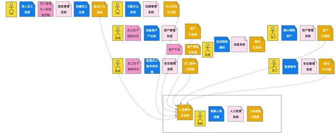 由上文的价值流热力图,我们知道公司的入职跟踪流程亟待建设:入职跟踪和员工信息管理能力缺乏;资产管理&设施管理&安全管理有基础能力,但是需要提升。本次使用了事件风暴方法,业务,产品和研发一起梳理入职跟踪过程,目的是建设入职跟踪能力。