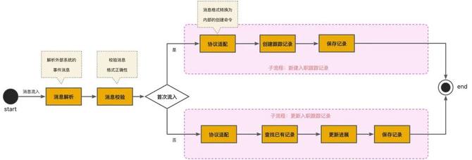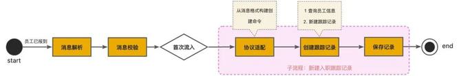员工入职跟踪接收来自信息管理系统,资产管理系统,安全管理系统的事件,更新入职进展。设计后的流程模型如下图。增加了技术节点: 消息解析,校验,协议适配;为保持流程清晰性,将判断是否"首次流入"的节点提前到了协议适配前执行。