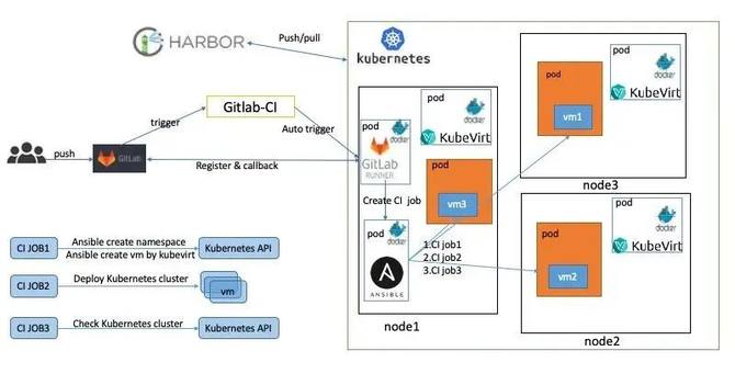 这里利用了GitLab、gitlab-runner、ansible和kubevirt等开源软件构建了CI流程。