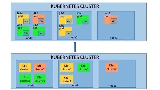 如上图所示,当开发人员提交多个PR时,会在k8s集群中创建多个job,每个job都会执行上述的CI测试,互相不会产生影响。这种主要使用kubevirt的能力,实现了k8s on k8s的架构。