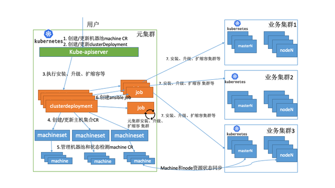 【扩展控制器】:主要用于扩展集群管理的功能的附加控制器,在部署kubernetes-operator我们做了定制,可以选择自己需要的扩展控制器。比如addons控制器主要负责addon插件的安装和管理。clusterinstall主要生成ansible执行器。remoteMachineSet用于多集群管理,同步元数据集群和业务集群的machine状态。还有其它的如对接公有云、dns、lb等控制器。
