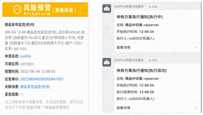 核心思路是一切操作标准化、流程化、自动化,降低人为干预、提升操作效率。像商品发布/商品管理都有一些自动容灾预案,可以在出现问题时自动快恢。下面的案例是周末出现的一次风险预警就是通过自动执行快恢避免了线上故障的发生。