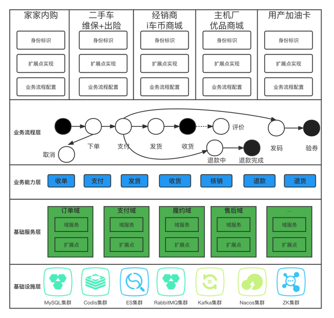 基础服务层:按域组织的基础服务、域服务内针对不同业务的差异提供扩展点。