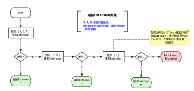 在运行时,通过业务身份定位扩展点实现类,然后执行扩展点实现的逻辑。定位扩展点实现的时候支持三层路由,首先会按照useCase+bizId+scenario找扩展点实现,如果没有则按照useCase+bizId+scenario默认值查找,如果还未找到则根据useCase+bizId默认值+scenario默认值查找,具体原理如图所示: