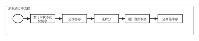 以用户取消订单场景为例,在修改前各业务的用户取消订单的逻辑为修改订单状态为已取消状态然后执行同一个流程,流程的执行顺序为硬编码,伪代码如图所示: