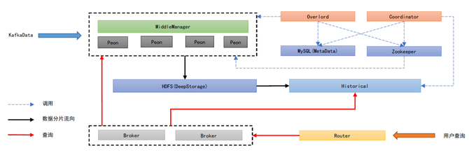 分析完用户习惯,再看下目前的数据层架构。多维监控底层的数据存储/查询引擎选择了 Apache-Druid 作为数据聚合、存储的引擎,Druid 是一个非常优秀的分布式 OLAP 数据存储引擎,它的特点主要在于出色的预聚合能力和高效的并发查询能力,它的大致架构如图: