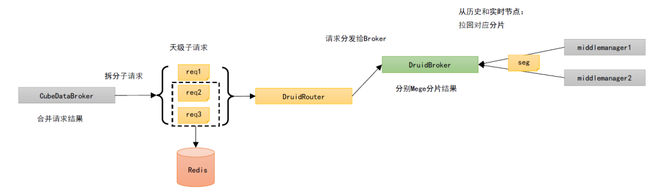 这里可以发现,查询 1 和查询 10,绝对不可能出现在缓存中。因此这两个查询一定会被转发到 Druid 去进行。2~9 查询,则是先尝试访问缓存。如果缓存中不存在,才会访问 DruidBroker,在完成一次访问后将数据异步回写到 Redis 中。