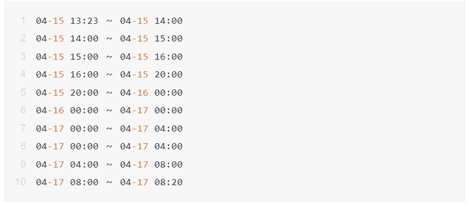 举个例子:例如 04-15 13:23 ~ 04-17 08:20 的查询,会被分解为以下 10 个子查询: