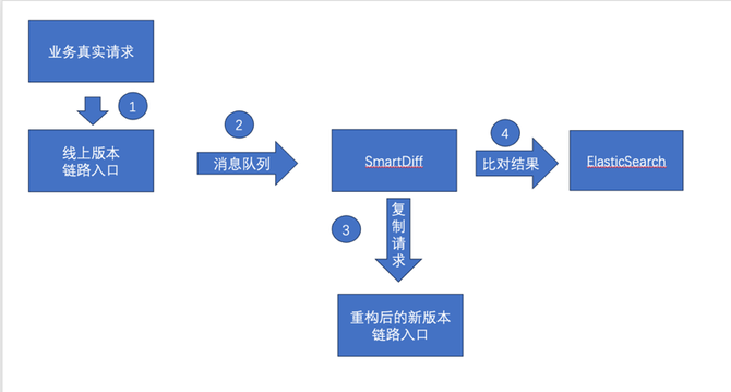 b. 比对工具 SmartDiff 订阅消息队列,复制请求重构后的版本链路入口,拿到结果后和线上版本结果比对