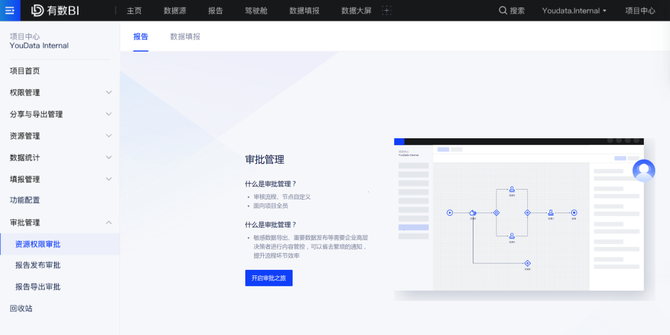 假设你依旧是一名项目管理员,依次点击项目中心-审批管理-资源权限审批,选择需要设置审批流的对象(已支持报告和数据填报,后续将支持其他类型资源),然后配置审批流程: