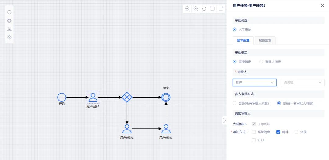 用户任务:需要用户完成操作的节点,如审批、编辑;可添加多个,节点间通过线路