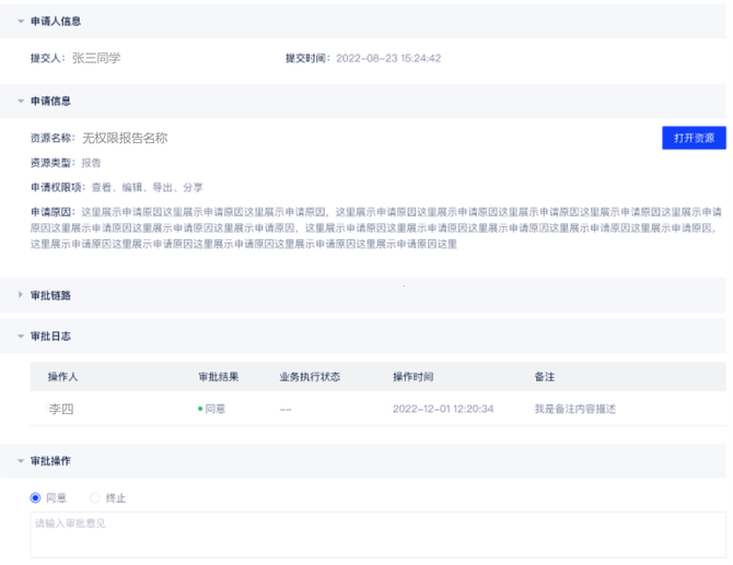 其实这个流程让用户直接找有决策权的人申请权限才是更优解法,那么在产品中就需要做两件事,一是需要无权资源仍可见,意为让没查看权限的用户不至于啥都看不见(至少能看见标题),然后可以主动发起申请;二是开启并配置审批流程,让有决策权的人(如资源创建人、部门主管)在线审批。