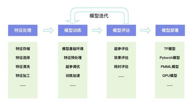整个模型建模流程主要需要四大步:特征处理、模型训练、模型评估、模型部署。并且模型还需要进行不断的迭代才能保证模型效果。