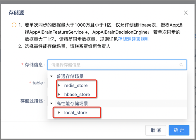 特征平台目前支持在线特征的存储,简单来说用户可以通过在AI平台点通过页面配置化的方式,将hive表数据或者kafka、rocketmq数据,同步到hbase、hedis、redis等在线存储中,也支持将数据存储到rocksdb进行本地化存储。如下图所示: