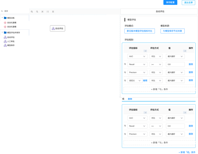 通过自动化建模后,模型选择手动评估或者自动评估。以自动保存为例,可以在评估时选择评估的指标值,以及评估规则。后续模型训练后即可通过评估结果进行模型自动替换。