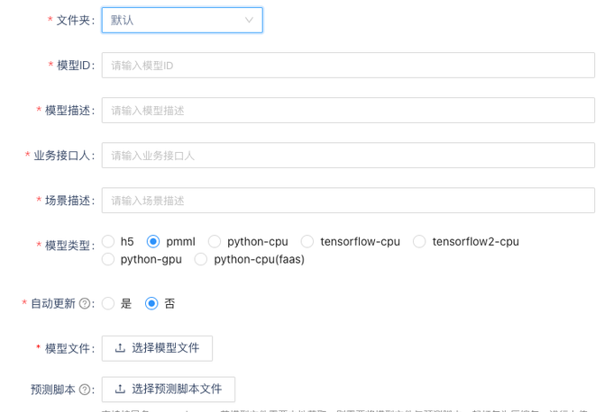 支持TF模型、Pytorch模型、PMML模型、GPU模型。AI平台模型支持TensorFlow模型、PMML模型、Pytorch模型、GPU模型,还支持Faas化部署,如下所示,可以选择不同的类型,将模型文件上传,AI平台会将模型部署到对应的应用集群中。