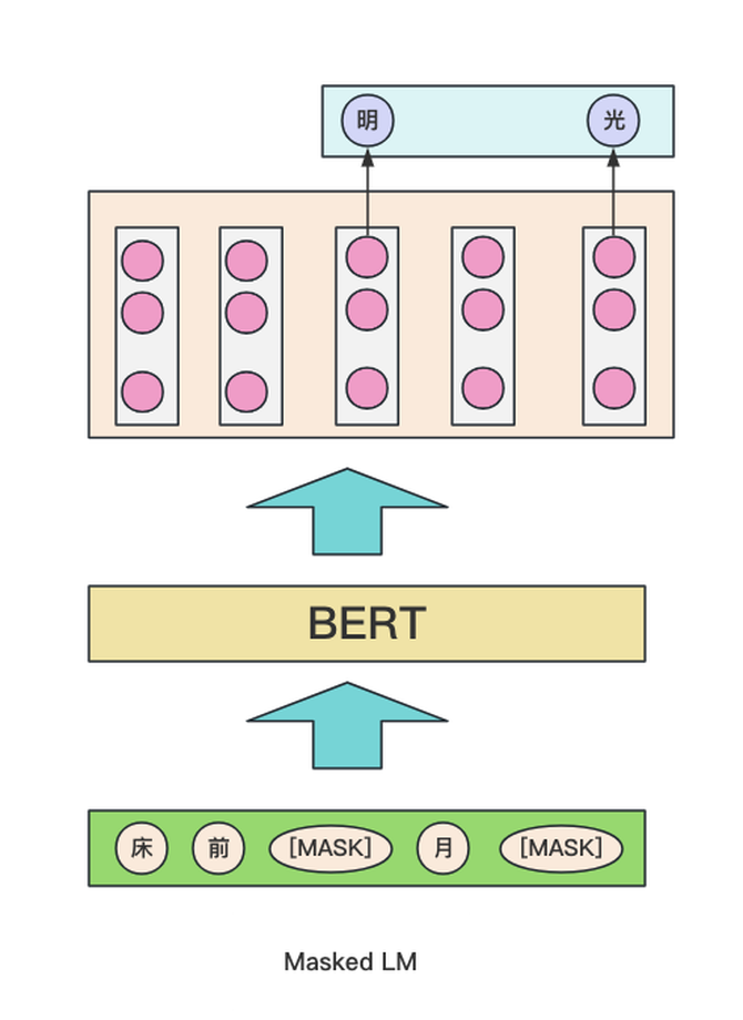 该思想来源于完形填空,简单来说,在一句话中,随机抹去这句话的一个或者多个词汇,要求根据剩余的词汇进行预测抹去的词分别是什么。如下图所示:bert分别隐去了一句话中的两个字,然后让模型进行“完形填空”自动补全。