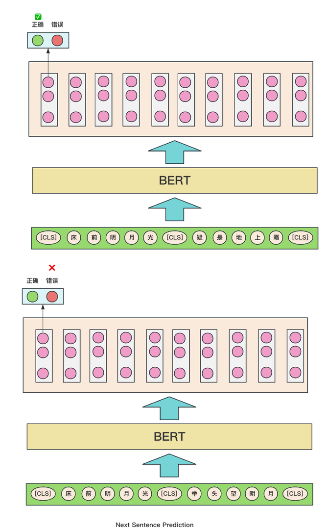 如下图所示:输入两句话,让模型能够判断是否为连续的句子,一个是正确的连续句子,一个是错误的连续句子。