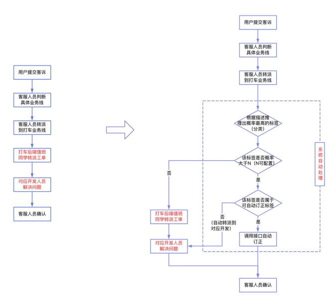 原流程如下图左边所示:用户在哈啰app提交客诉->客服人员判断具体业务线->客服人员转派工单到打车业务线->打车后端值班同学转派工单->开发解决问题->客服人员确认。