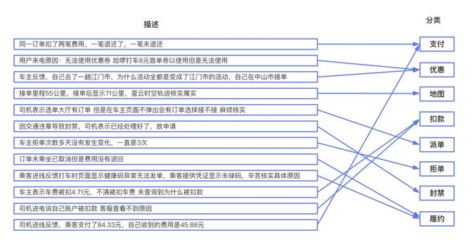 打车侧的原方案为关键词匹配,即根据客服的描述,通过关键字进行匹配,该方案的准确率很低(准确率不足10%)。