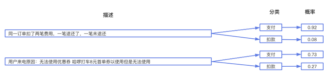 算法根据客诉描述,推理出该描述对应的标签和概率,然后对系统留下概率超过一定值的分类(线上为0.7),进行转派。如下图所示: