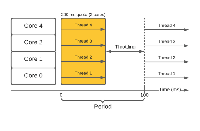 由于容器内的多处理/线程,这种方法被证明是有问题的。这会使容器过快地用完配额,导致它在剩余时间段内受到限制。如下图所示: