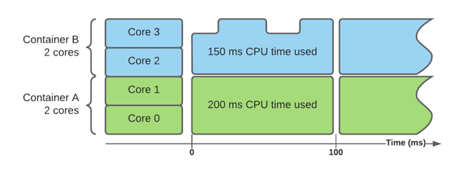 在上面的例子中,有一个需要 2 个内核的容器,这相当于每周期需要 200 毫秒的 CPU 时间。