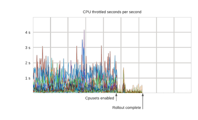 这样做的结果是 P99 的延迟变得更加稳定。下面是一个在启用 cpuset 时对生产数据库集群(每一行是一个容器)进行节流的例子。正如预期的那样,所有节流都消失了:
